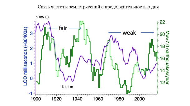 Багаторічні спостереження показали, що землетруси трапляються частіше, коли швидкість обертання Землі навколо своєї осі трохи зменшується за рахунок внутрішніх причин.